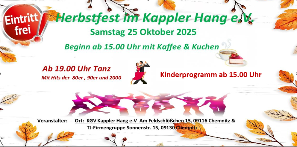 wir laden Euch herzlich zu unserem Herbstfest am 25.10.2025, ab 15 Uhr auf dem Vereinsgelände des Kleingartenvereins Kappler Hang e.V. ein!